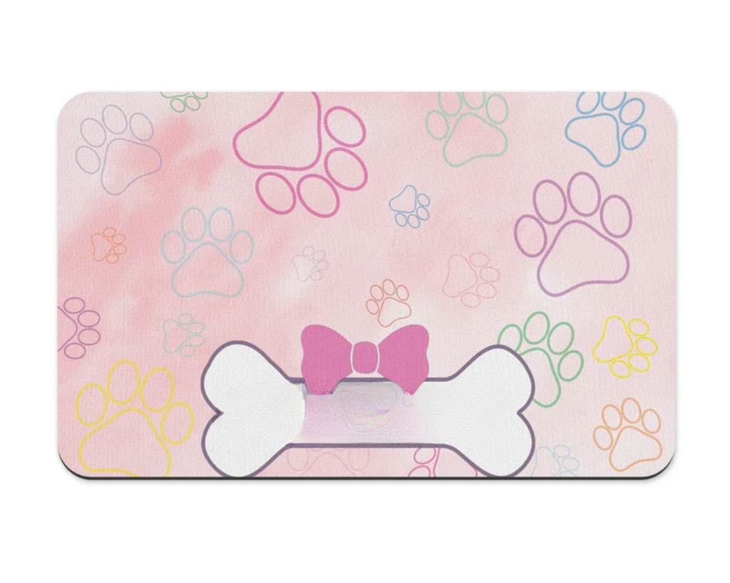 Design Details: The Blush Watercolor Flowers with Bone and Bow Design is intricately and permanently printed onto the pet mat, creating a charming and vibrant centerpiece for your pet's feeding space. The black rubber backing ensures stability, keeping the mat securely in place during mealtime.